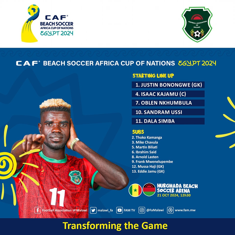 The Malawi Beach Soccer National Team will face the defending champions Senegal this afternoon at the Hurghada Beach Soccer Arena in the CAF Beach Soccer Africa Cup of Nations in Egypt.