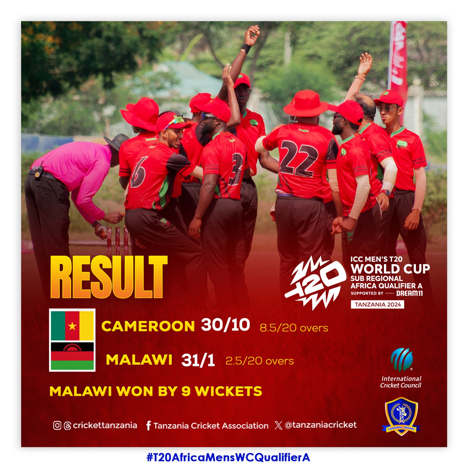 The Malawi Men’s Cricket National Team has secured their place in the next stage of the ICC Men’s T20 World Cup sub-regional qualifiers after a dominant 9-wicket victory over Cameroon at UDSM Ground in Dar es Salaam, Tanzania, this afternoon.