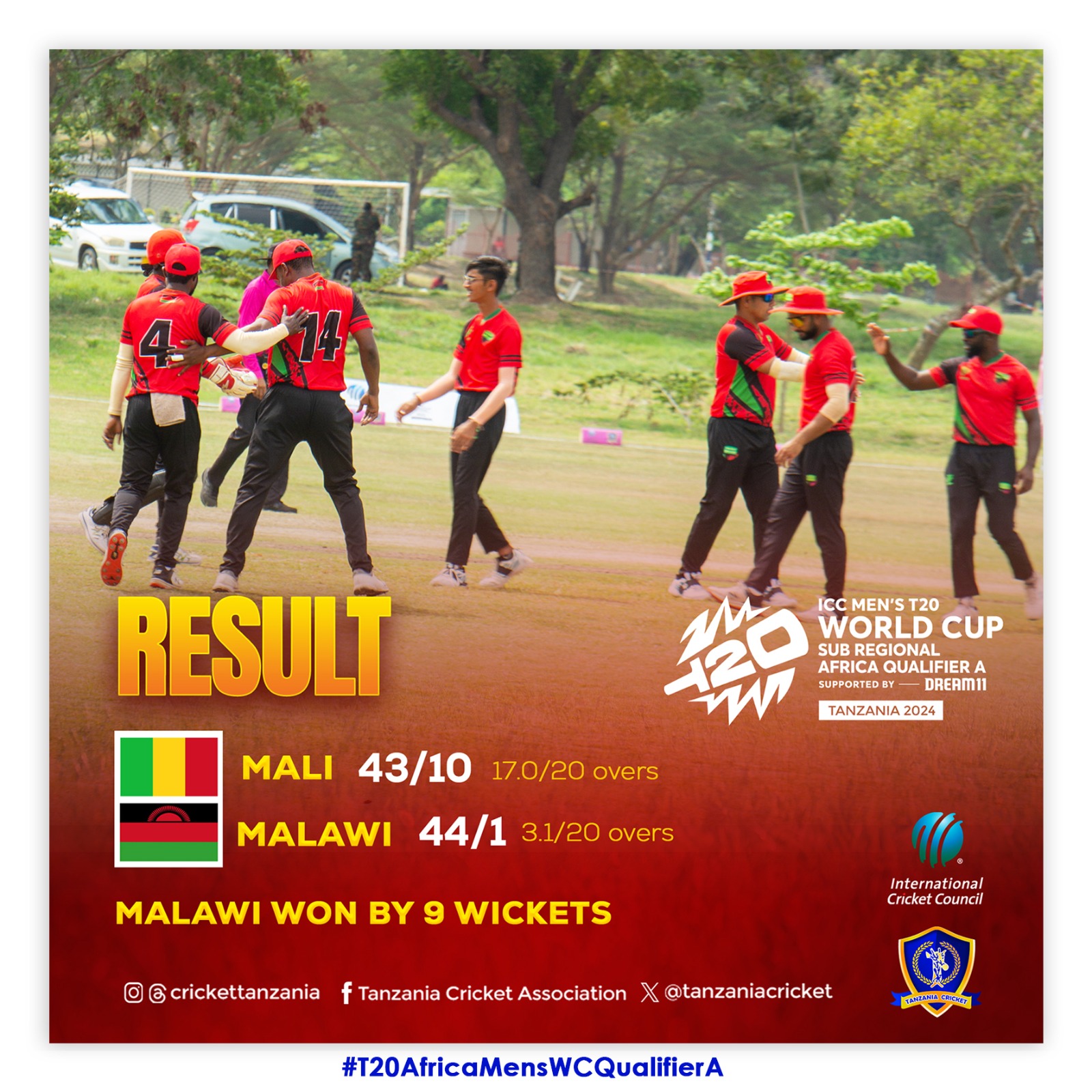 The Malawi Men’s Cricket National Team registered their third consecutive victory in the ongoing ICC Men’s T20 World Cup Sub-Regional Africa Qualifier A this afternoon, after a commanding 9-wicket win over Mali at the UDSM Ground in Dar es Salaam, Tanzania.