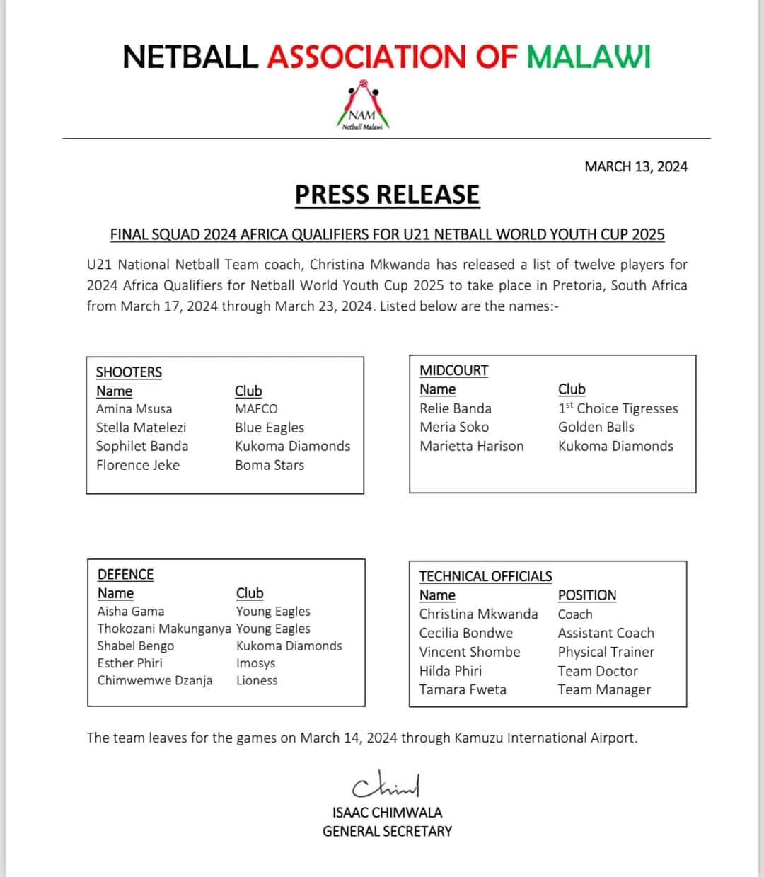 The Netball Association of Malawi (NAM) has announced the twelve players who will represent Malawi at the U21 Netball World Youth Cup 2025 Africa qualifiers in Pretoria, South Africa. The tournament will take place from March 17th to March 23rd, 2024.
